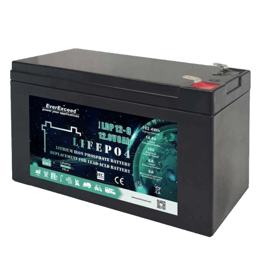 EverExceed пропонує літієвий акумулятор моделі LiFePO4 LDP 12-8 (12.8V-8AH), який відзначається довговічністю, ефективністю та стабільною роботою. Номінальна напруга становить 12,12.8 В, а ємність — 8 А·год.